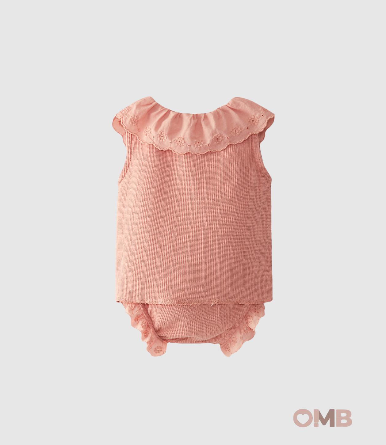 Completo due pezzi in jersey di cotone biologico testurizzato. Blusa con colletto arricciato in tessuto ricamato. Chiusura con bottoni automatici sulla spalla. Shorts con coulisse decorativa in vita e volant ricamato sulle gambe.