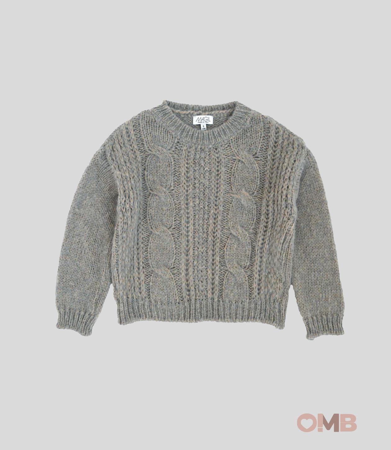 Caldo e raffinato maglione da bambina Magil, caratterizzato da una elegante lavorazione a trecce sul davanti. Il modello presenta girocollo classico, maniche lunghe con polsino e una vestibilità confortevole
