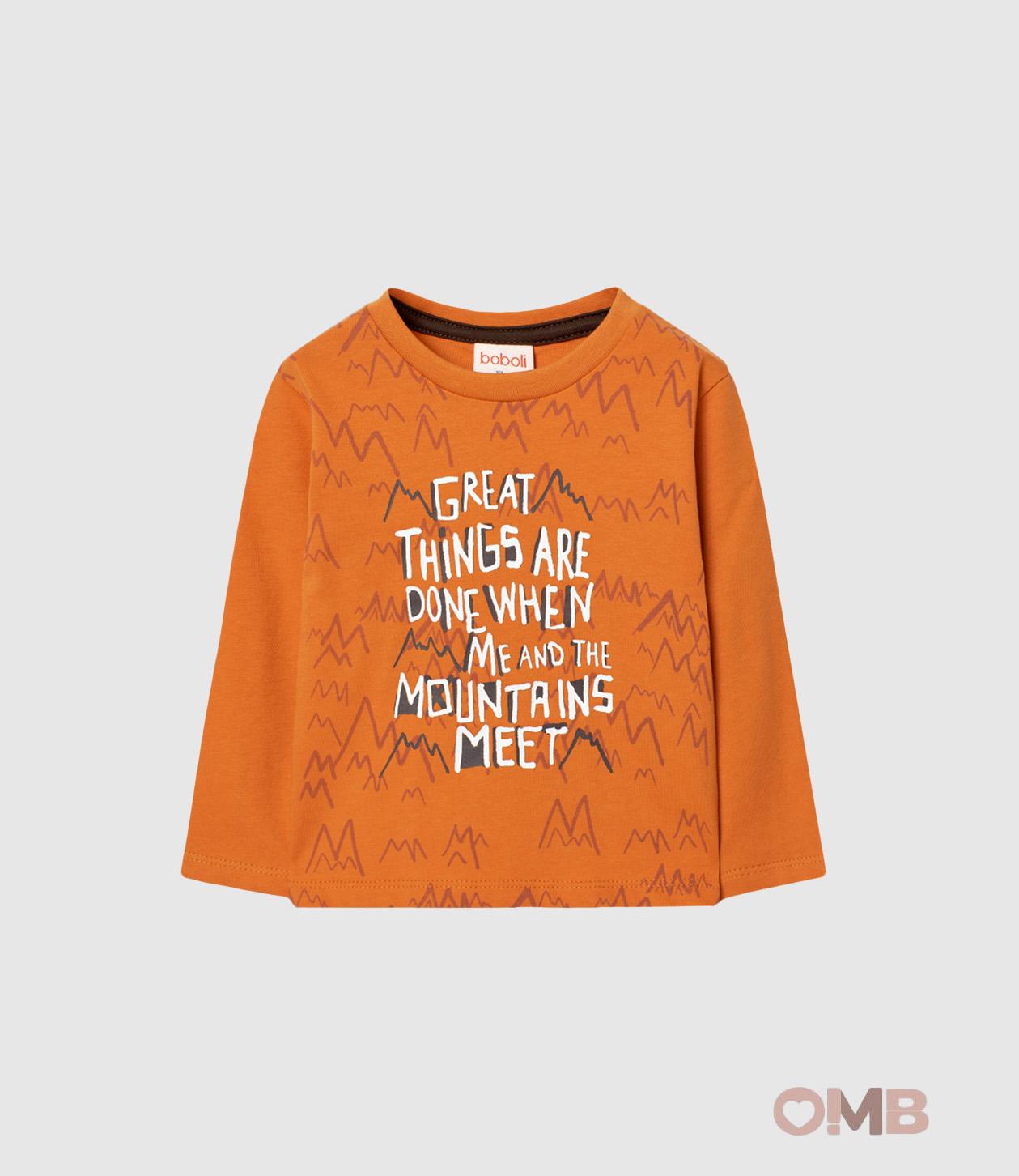 T-shirt da bambino in cotone, maniche lunghe con stampa frontale a contrasto.