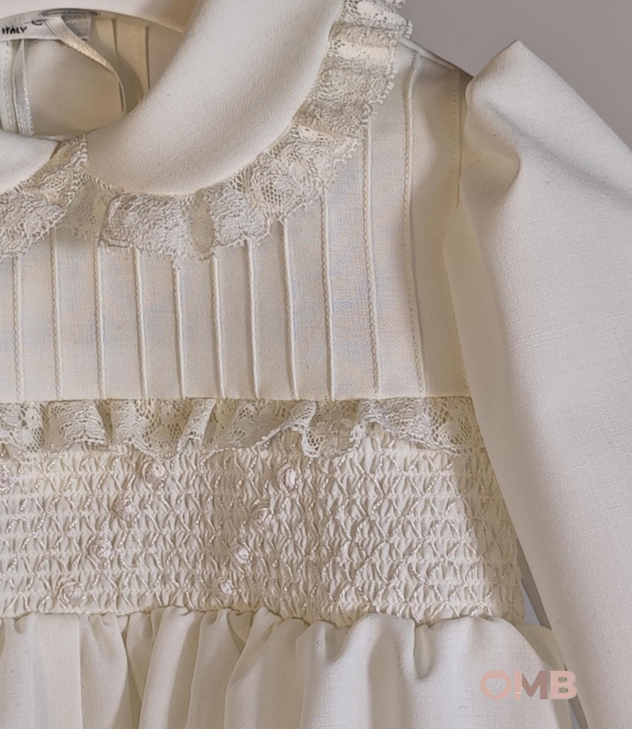 Pagliaccetto battesimale da neonata. Maniche lunghe, colletto con orlo e ricami. Parte anteriore con motivo nido d'ape.
