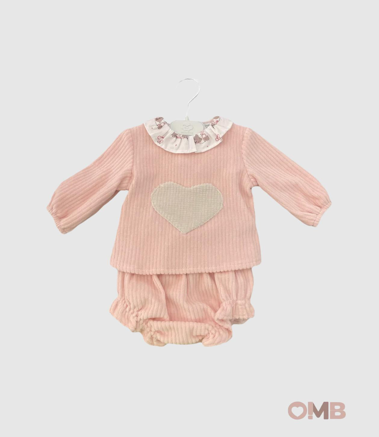 Completo neonata tinta unita. Colletto bianco a contrasto. Dettaglio cuore sul davanti.