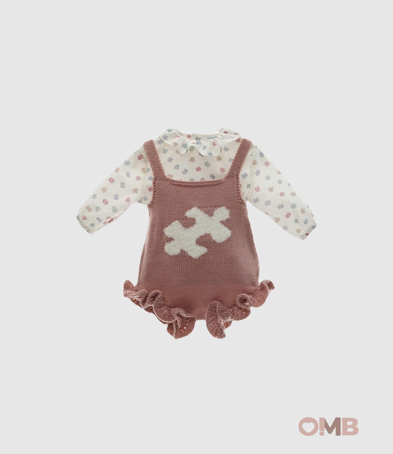La tutina è realizzata in maglia liscia rosa cipria con un pezzo di puzzle ecrù in rilievo. La camicetta è realizzata in batista ecrù con pezzi in varie tonalità.