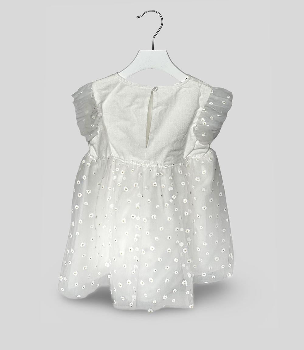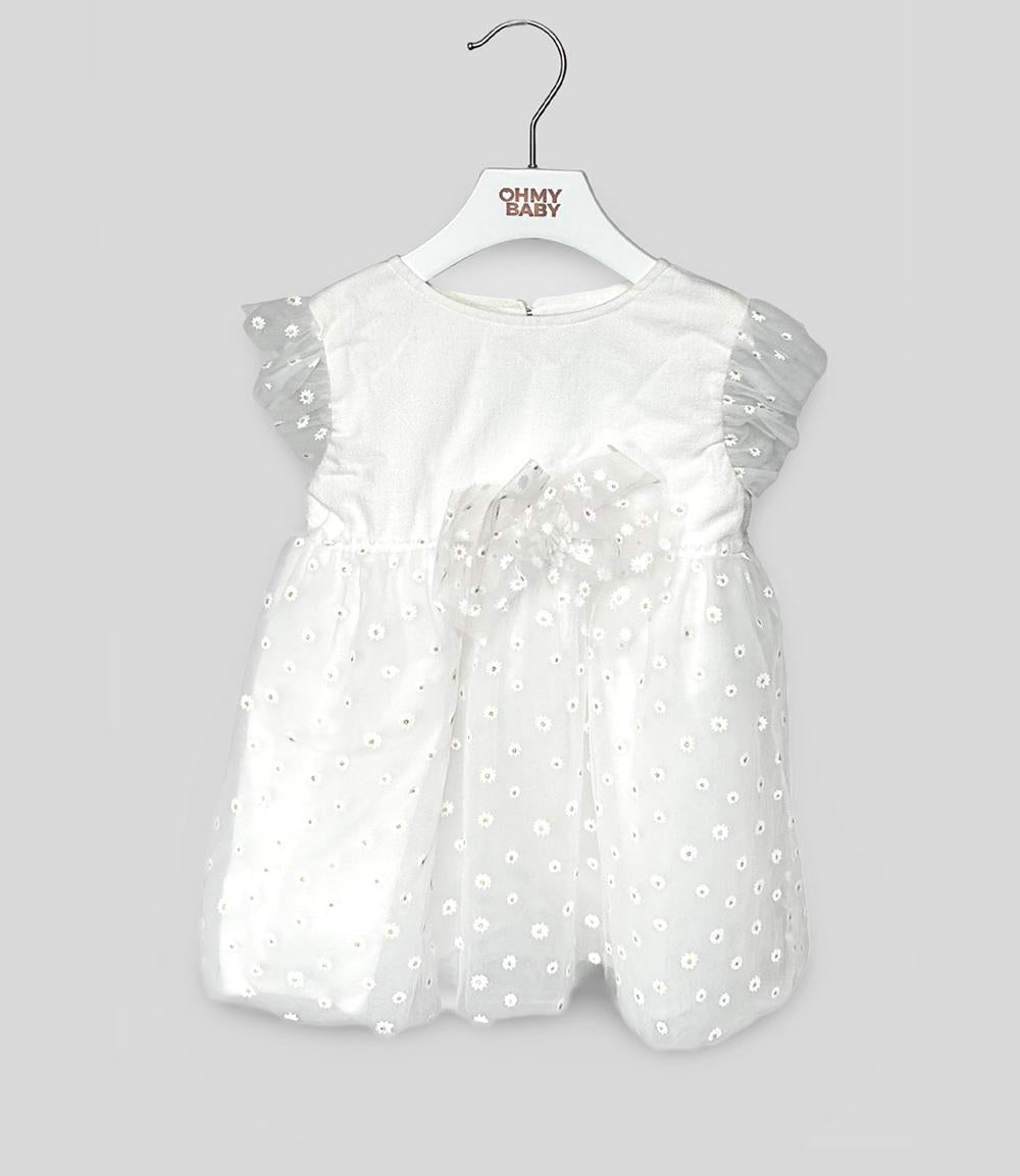 Le maniche sono corte e a sbuffo, realizzate in un leggero strato di tulle trasparente, decorato con piccole margherite.