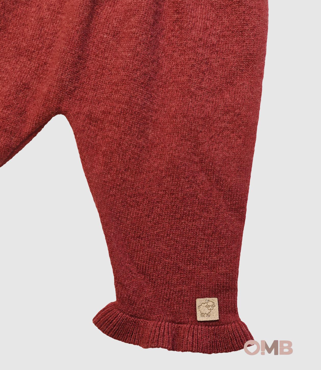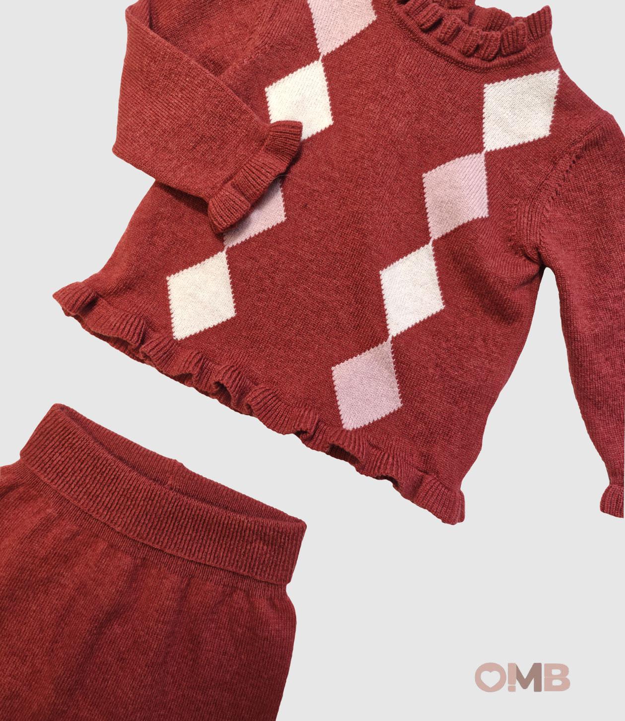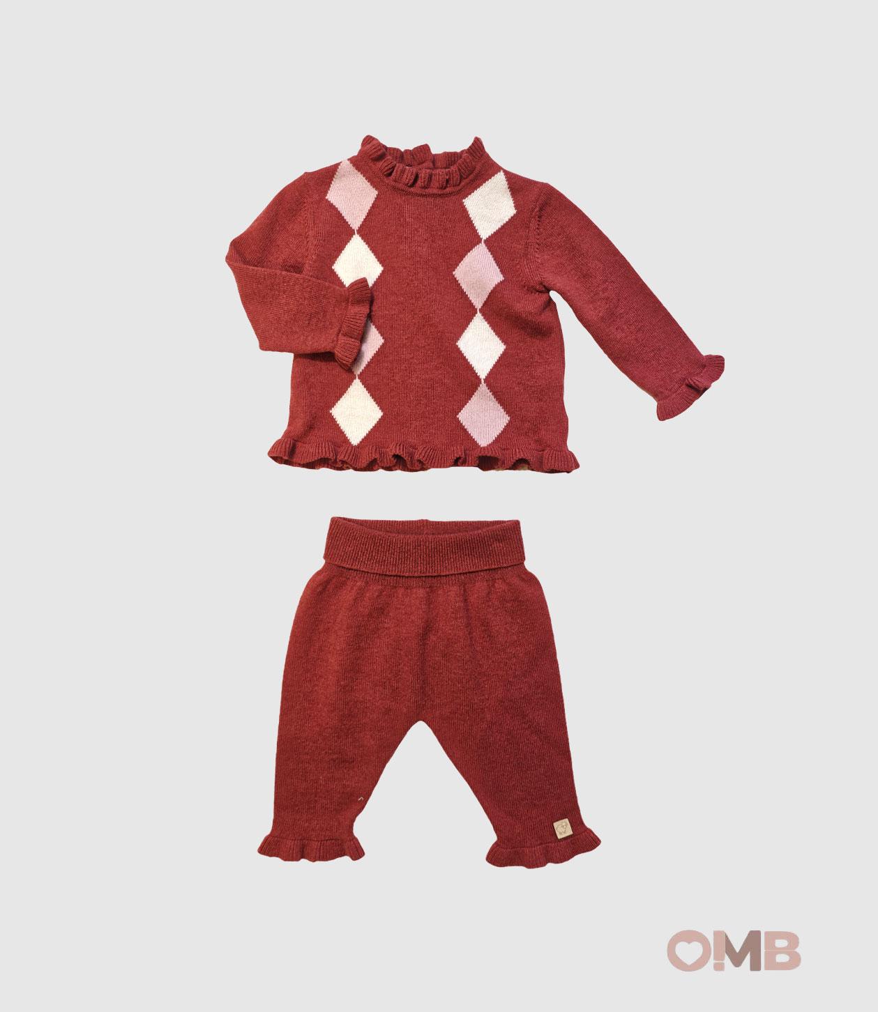 Completo in pura lana per neonata, composto da maglioncino con colletto e stampa a contrasto e dal pantalone coordinato.