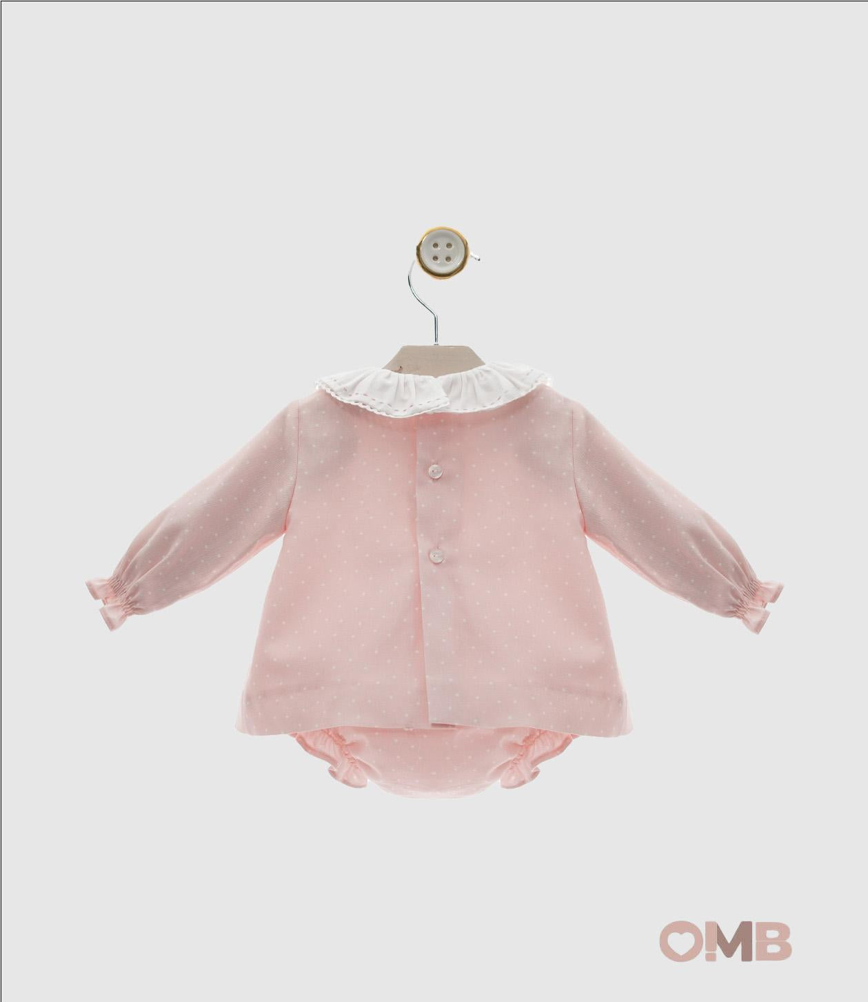 Il completo è realizzato in cotone morbido e traspirante, è perfetto per la pelle delicata dei più piccoli. Design romantico con micro pois bianchi, colletto arricciato e maniche lunghe.