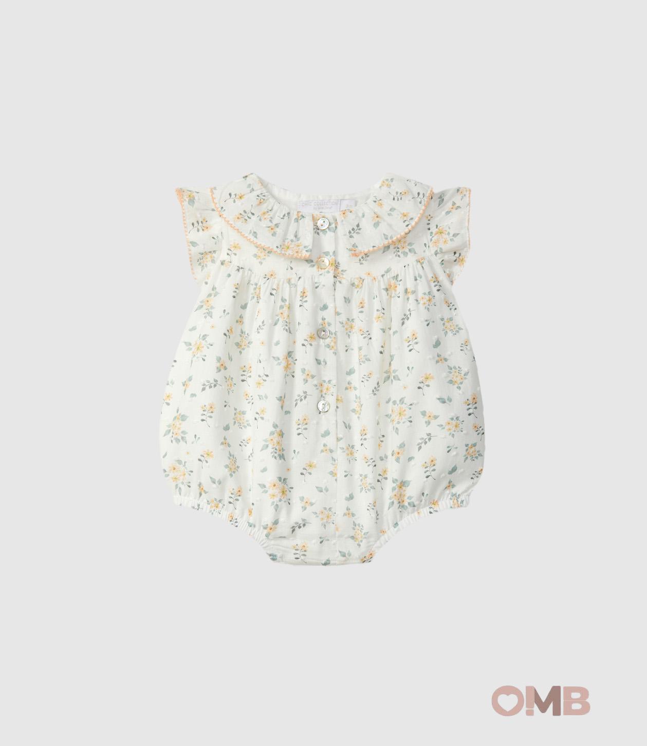 Pagliaccetto in tessuto con delicata stampa floreale. Dettaglio della silhouette in colore a contrasto. Chiusura con bottoni Laranjinha in madreperla sul davanti e bottoni a pressione tra le gambe.