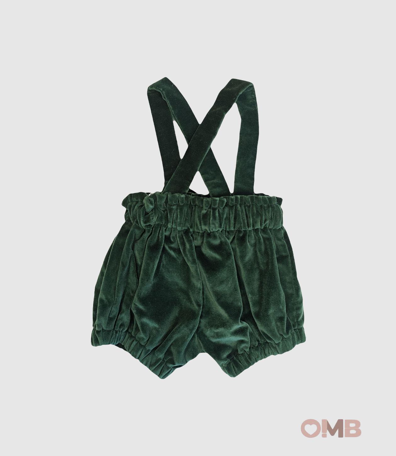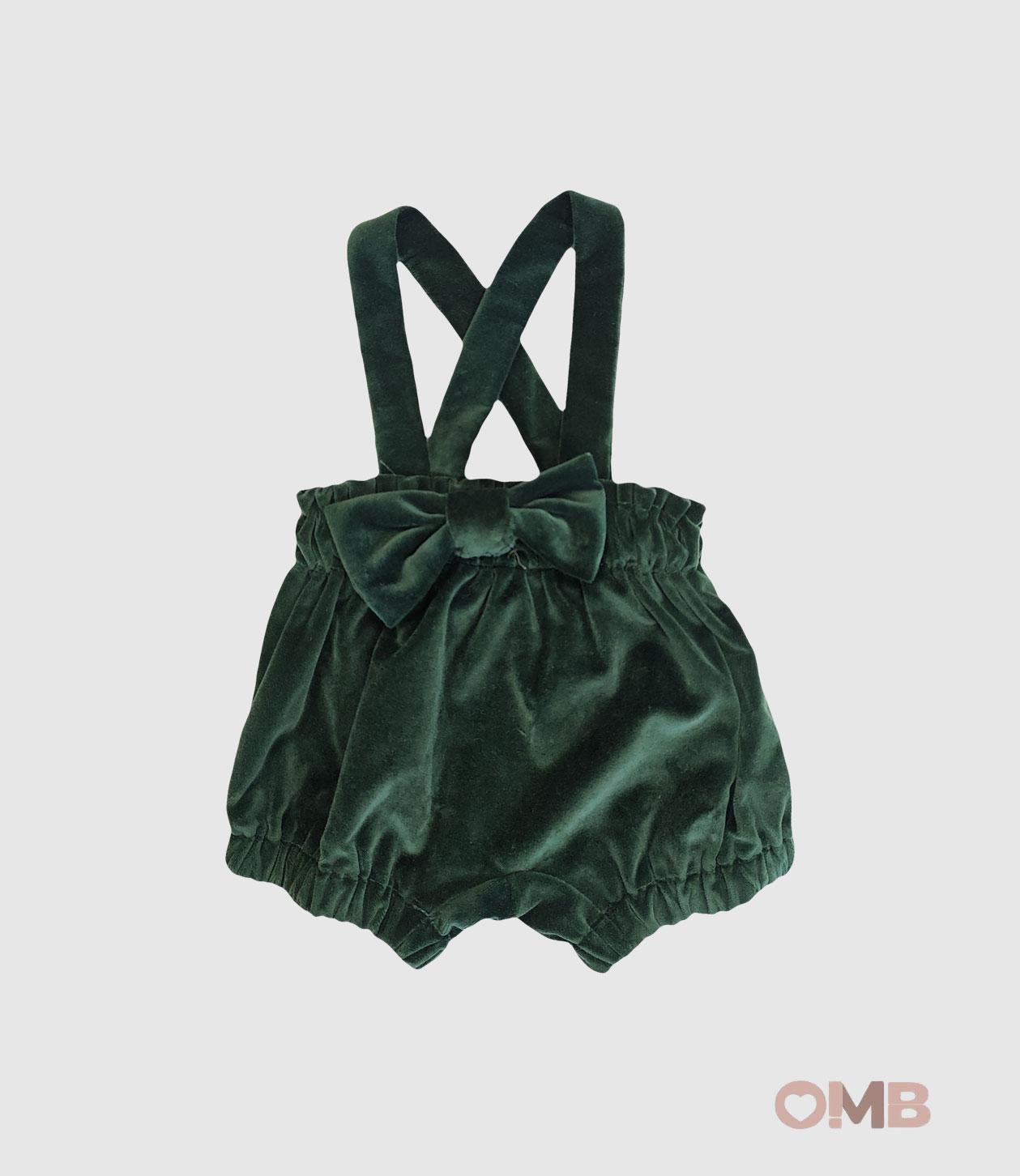 Salopette in velluto verde da neonata. Coulisse in vita con fiocco in tinta sul davanti. Fondo con elastico.