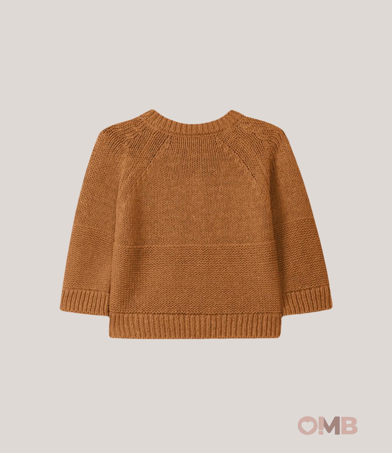 Cardigan lavorato a maglia con scollo rotondo. Chiusura frontale con bottoni in legno.
