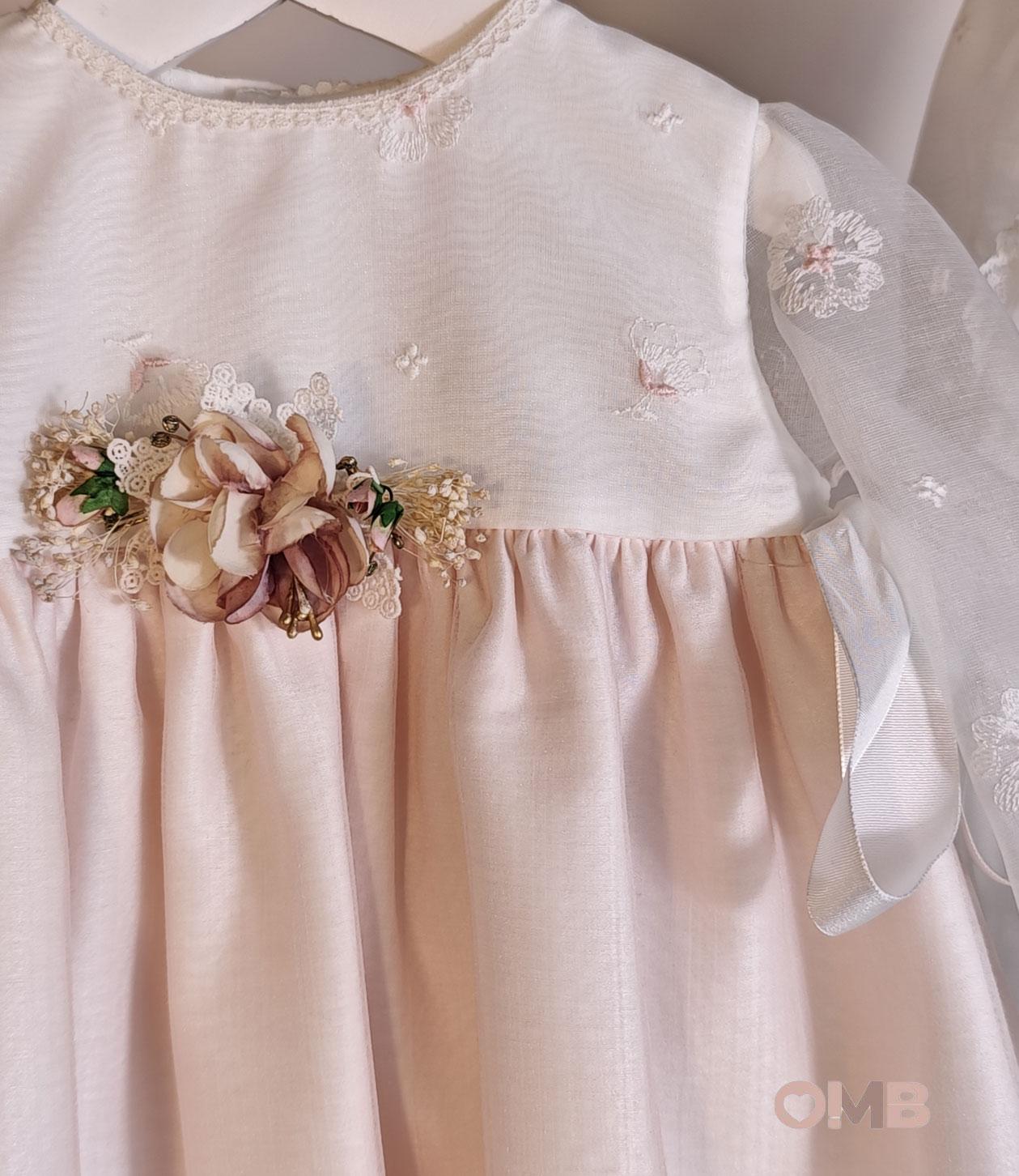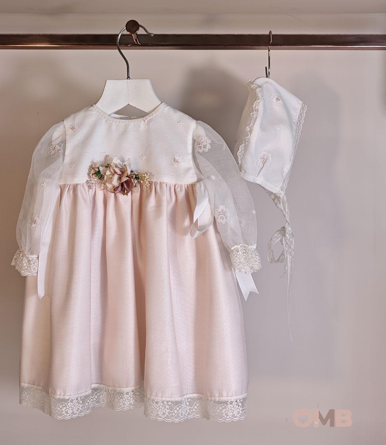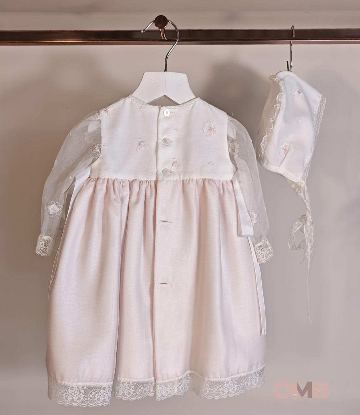 Abito battesimale da neonata con cuffietta abbinata. Parte superiore bianca con ricami rosa e dettagli fiori sul davanti. Chiusura con bottoni sul retro.