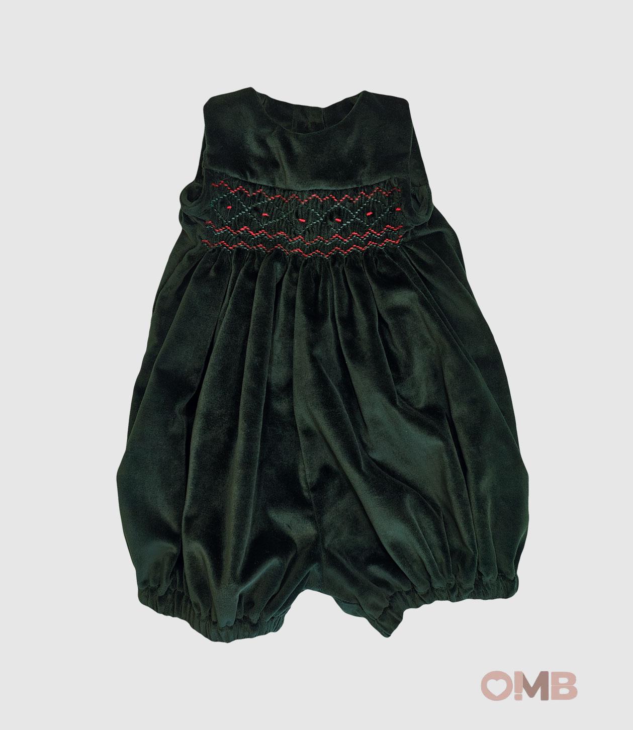 Pagliaccetto neonata in velluto verde. Elastico sul fondo. Giromanica. Chiusura con bottoncini sul retro. Lavorazione nido d'apea contrasto sul davanti.