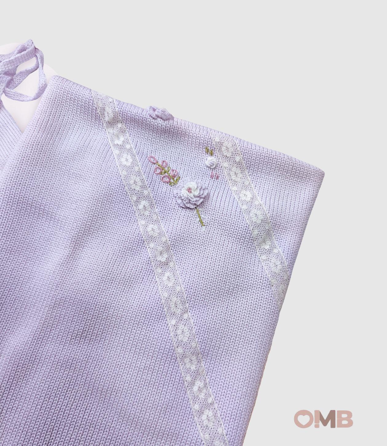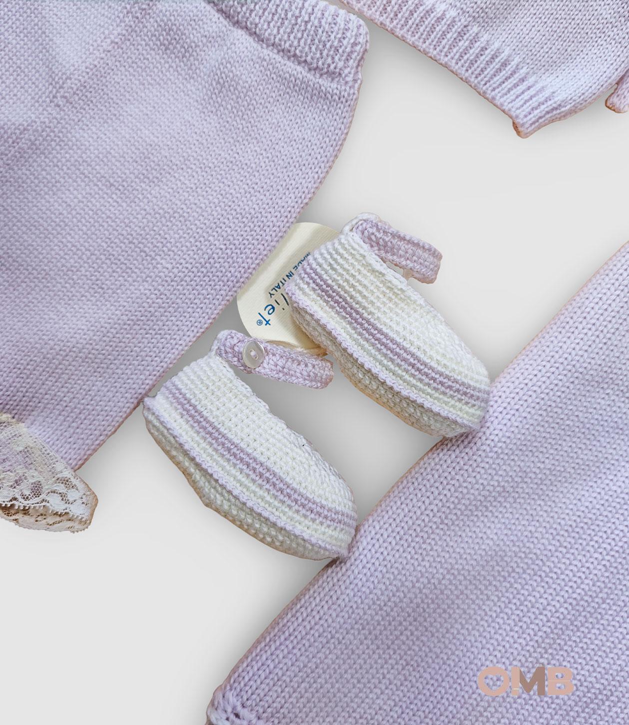 Set nascita composto da: completo due pezzi, copertina, scarpine e cappellino. Dettagli fiori e ricami.