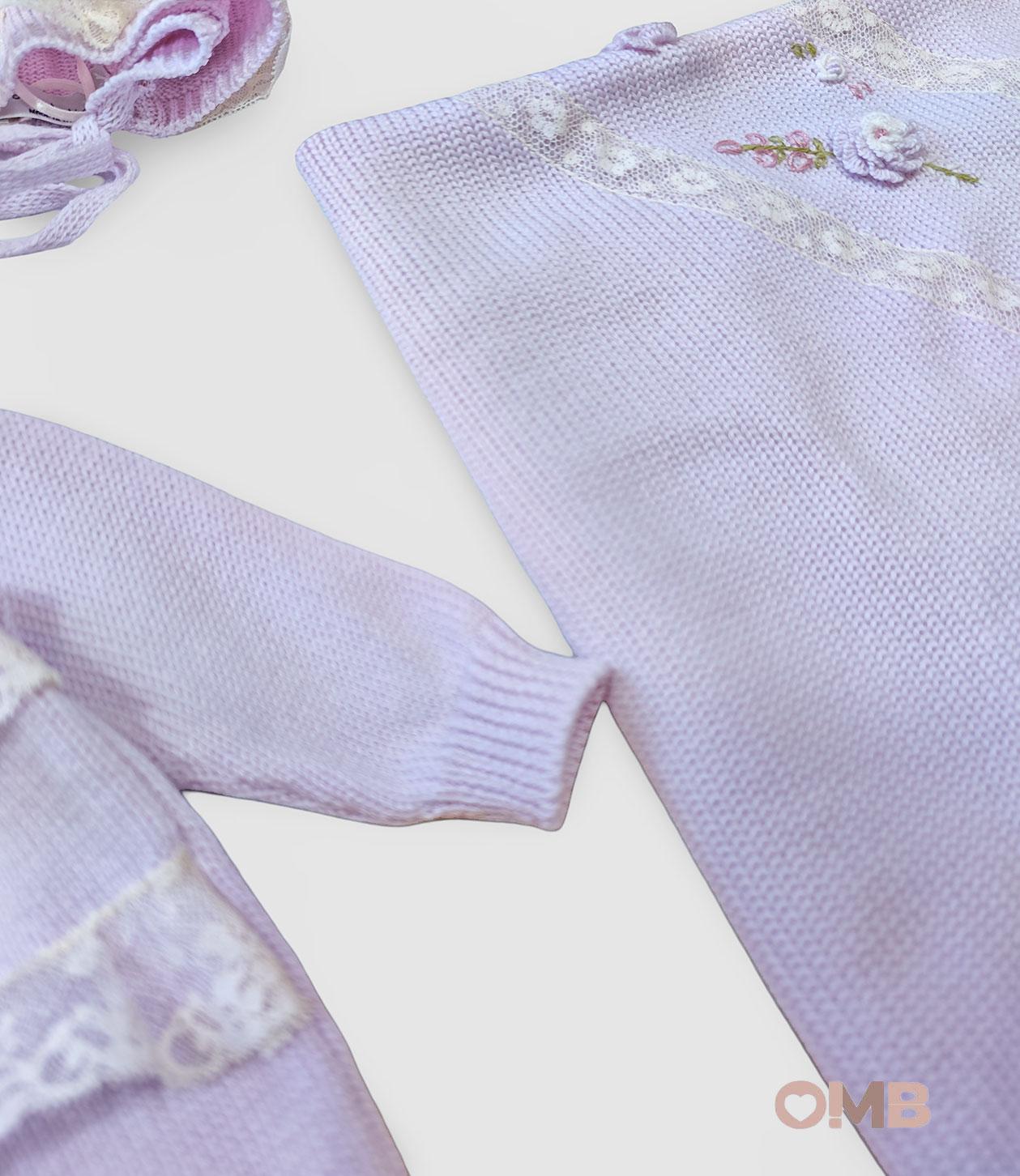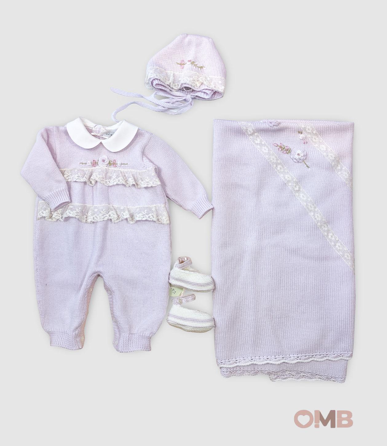 Set nascita composto da: tutina, copertina, scarpine e cappellino. Dettagli fiori e ricami.