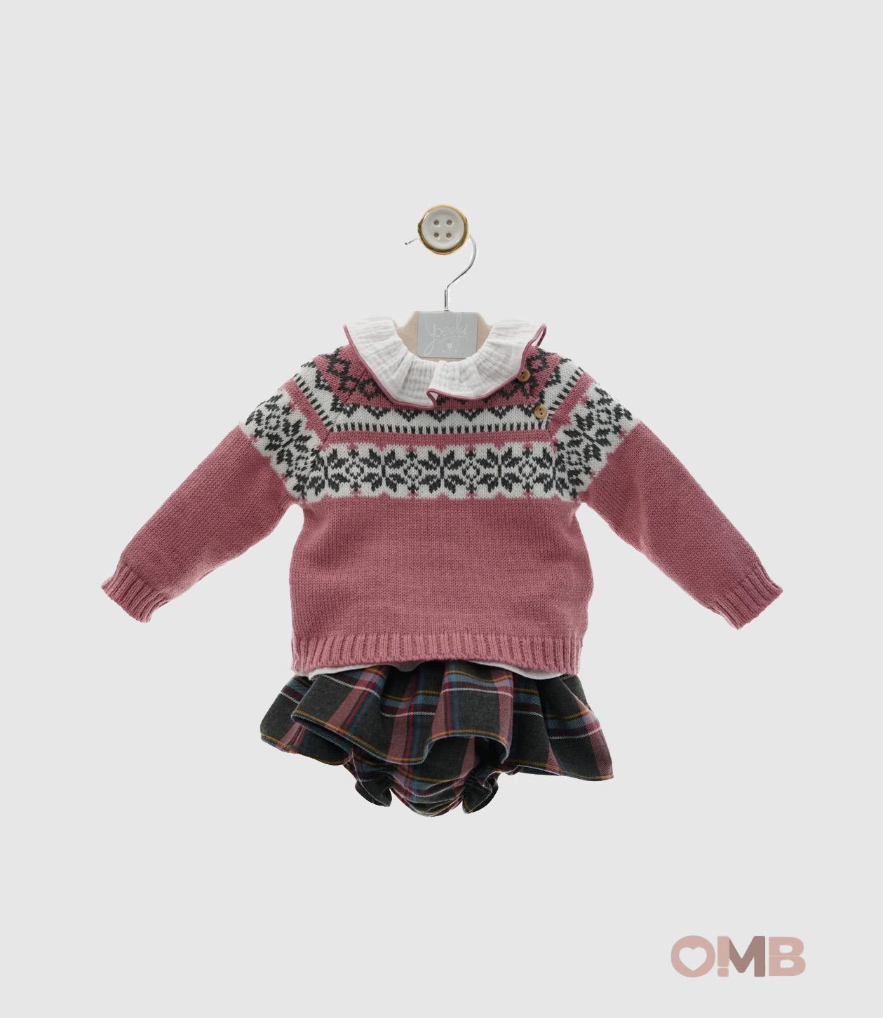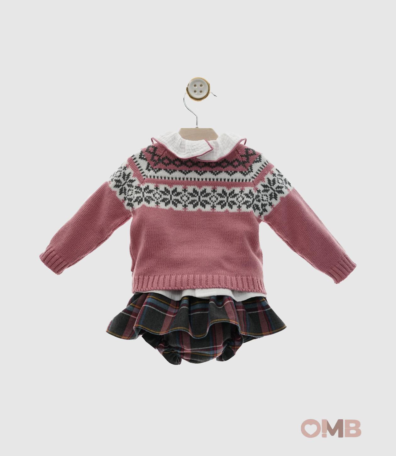 Completo tre pezzi. Maglione rosa con fantasia, camicia in cotone garzato e coulotte in felpa fantasia.