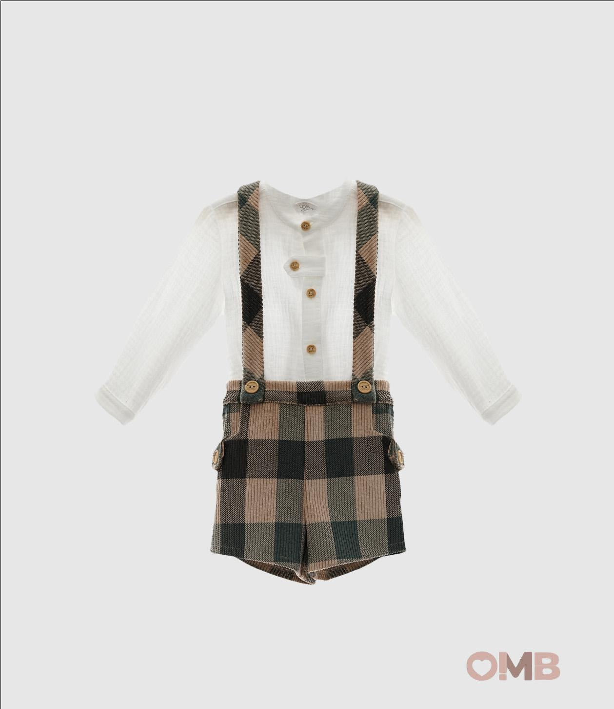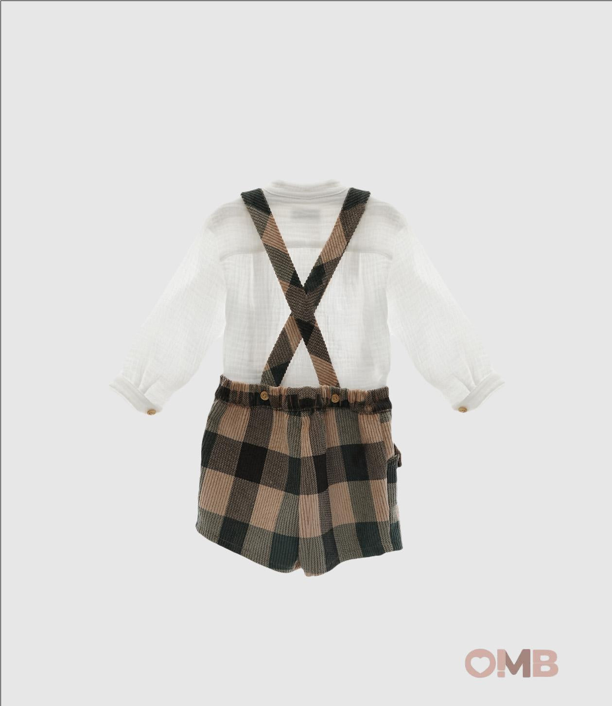 Il completo è composto da una camicia a maniche lunghe, in morbido tessuto bianco con colletto alla coreana e bottoni sul davanti, si abbina perfettamente ai pantaloni in velluto a coste sottili con fantasia a quadri nei toni caldi del beige e del verde muschio. I tiranti regolabili e la fascia elastica sul retro assicurano una vestibilità comoda e pratica.