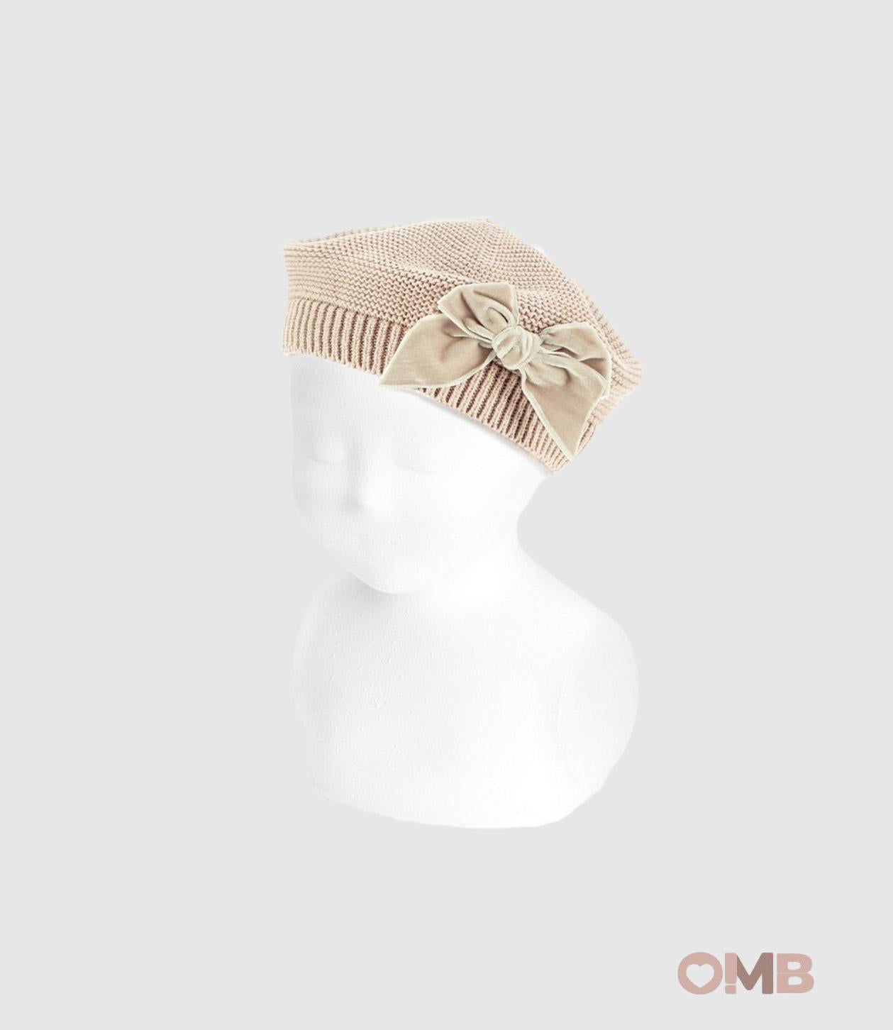 Basco neonata in cotone. Lavorazione punto legaccio. Dettaglio fiocco in velluto in tinta.