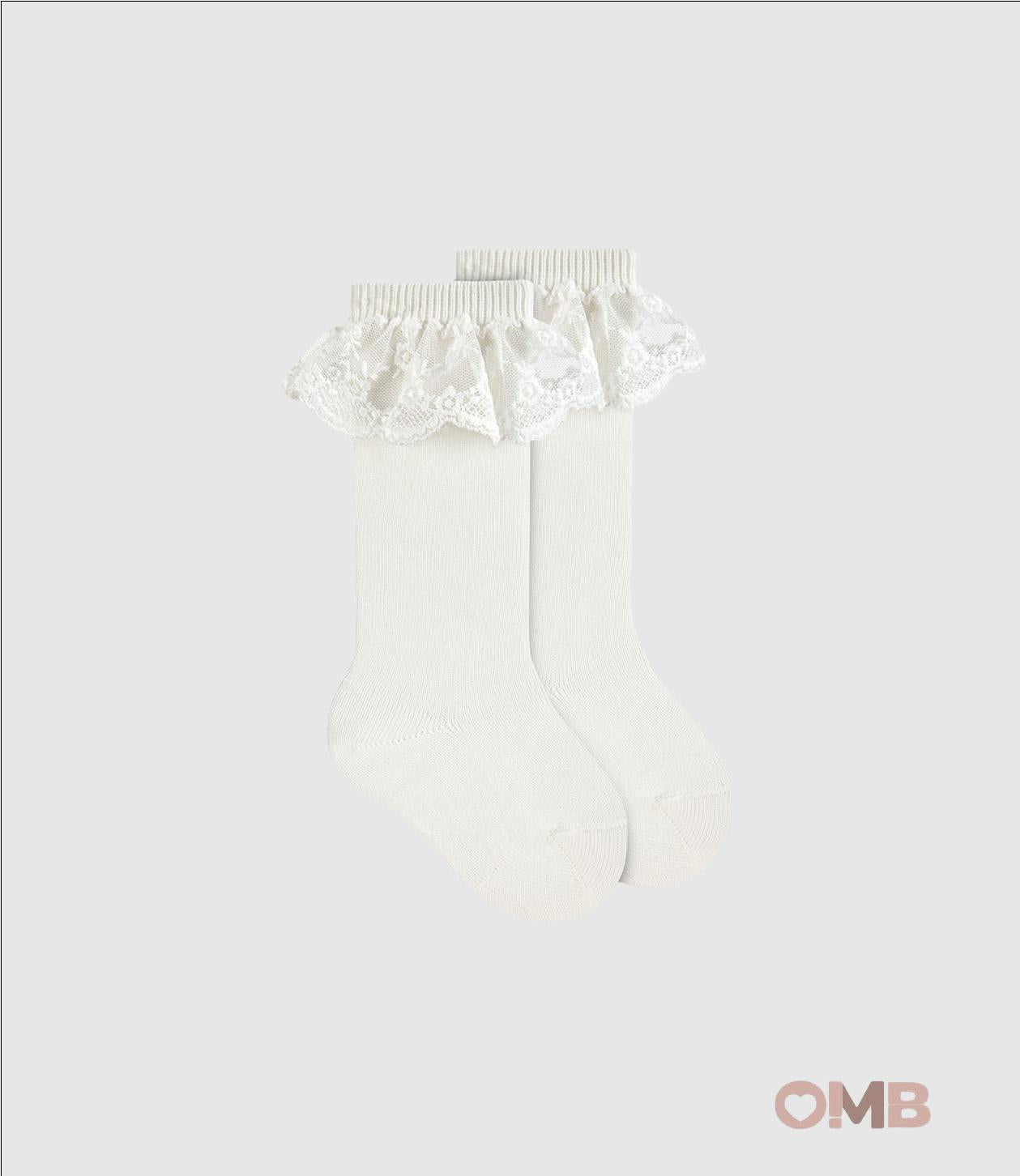 Calzini alti fino al ginocchio per neonati, con punta liscia e dettaglio in pizzo a fuselli sul polsino.
