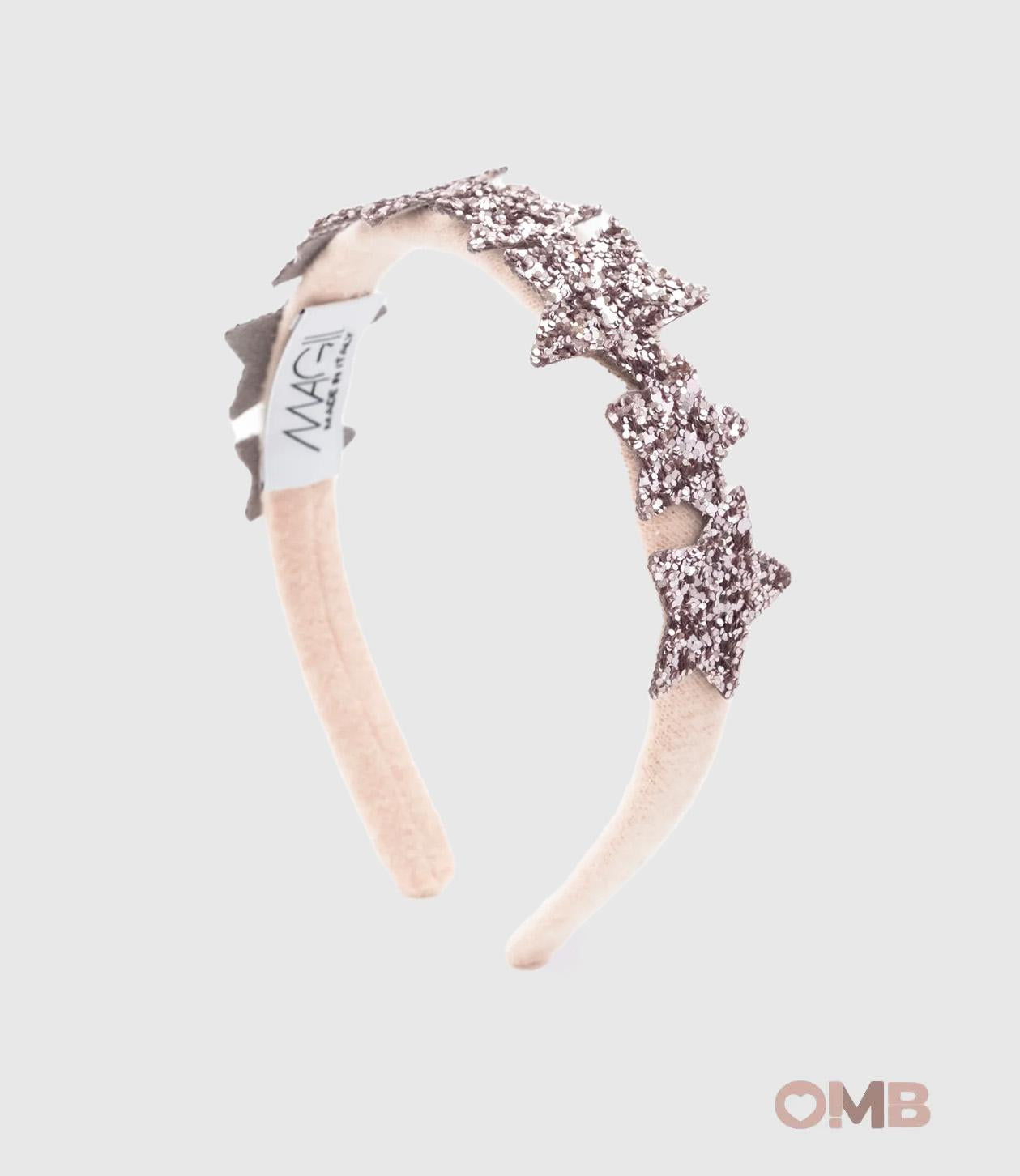 Cerchietto in punto milano con applicazione stelline glitter.