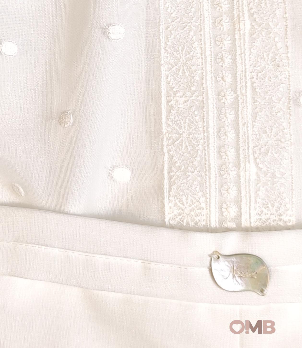 Completo battesimale neonata. Elastico sul fondo e in vita. Dettagli con ricami sulla parte superiore. Chiusura con bottoni sul retro.
