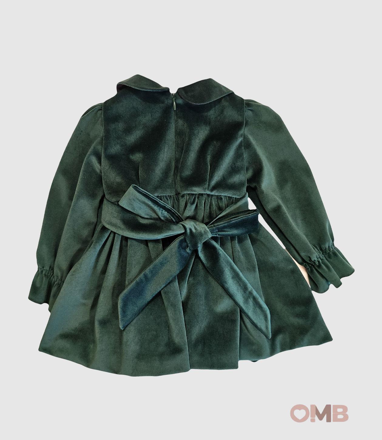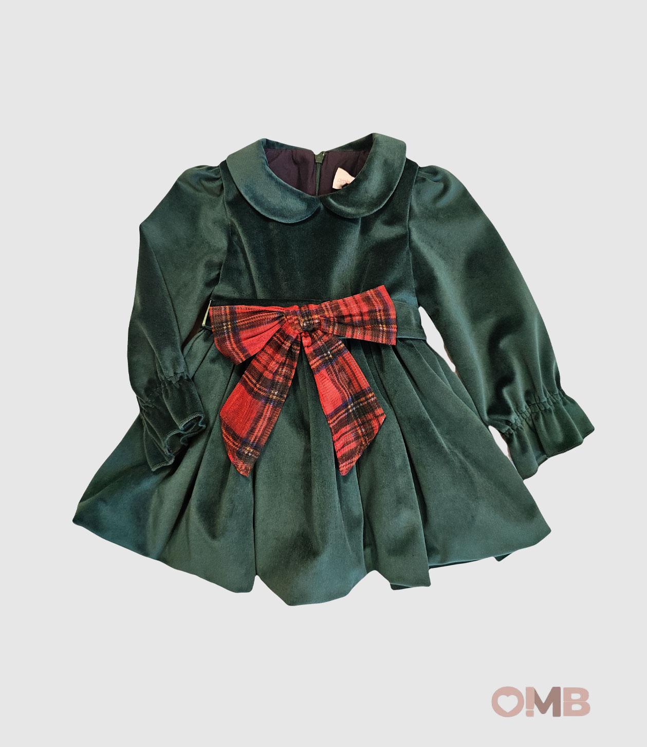 Abito in velluto verde per neonata. Maniche lunghe con elastico al polso. Fiocco tartan rosso sul davanti. Gonna a balze e chiusura con zip sul retro.
