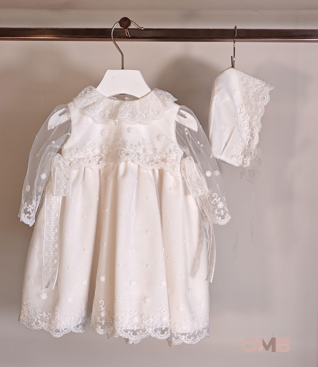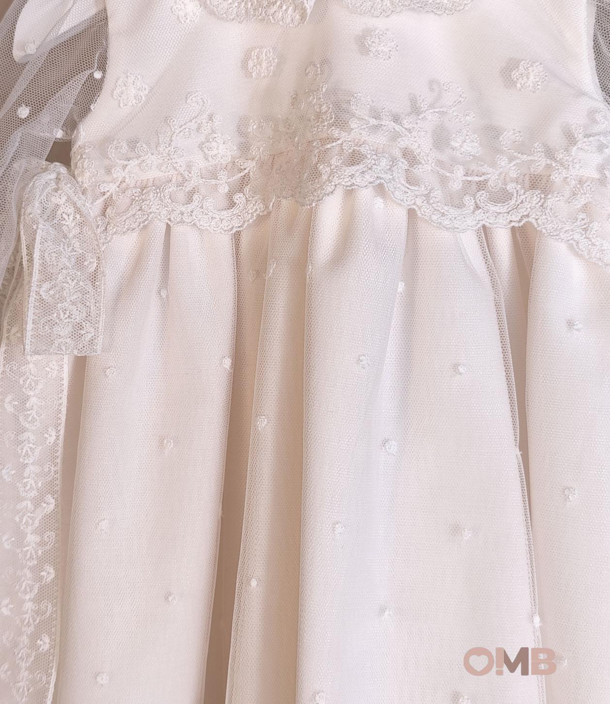 Maniche velate con ricami. Colletto ondulato con ricami. Chiusura sul retro.