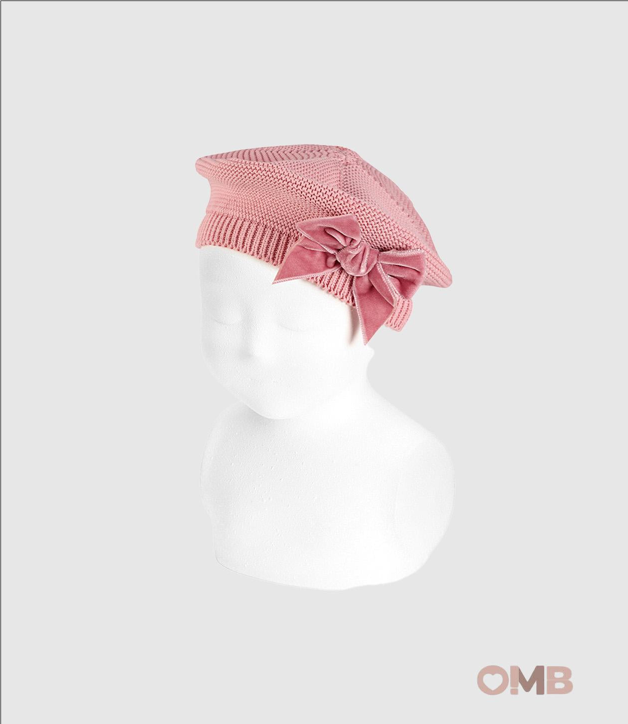 Basco neonata in cotone. Lavorazione punto legaccio. Dettaglio fiocco in velluto in tinta.