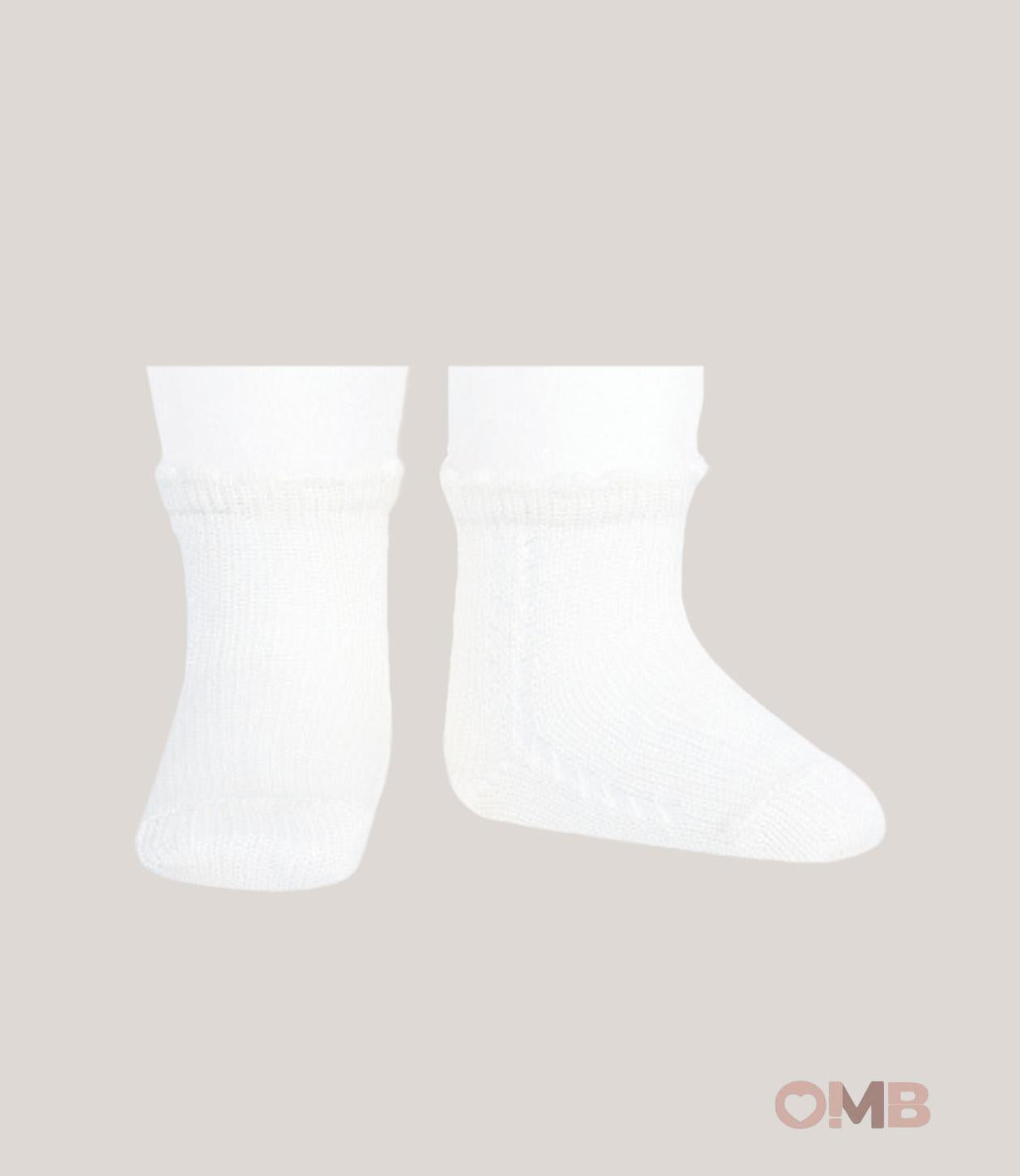 Calzini corti da bambina, colore bianco, in cotone e traforati sul lato.
