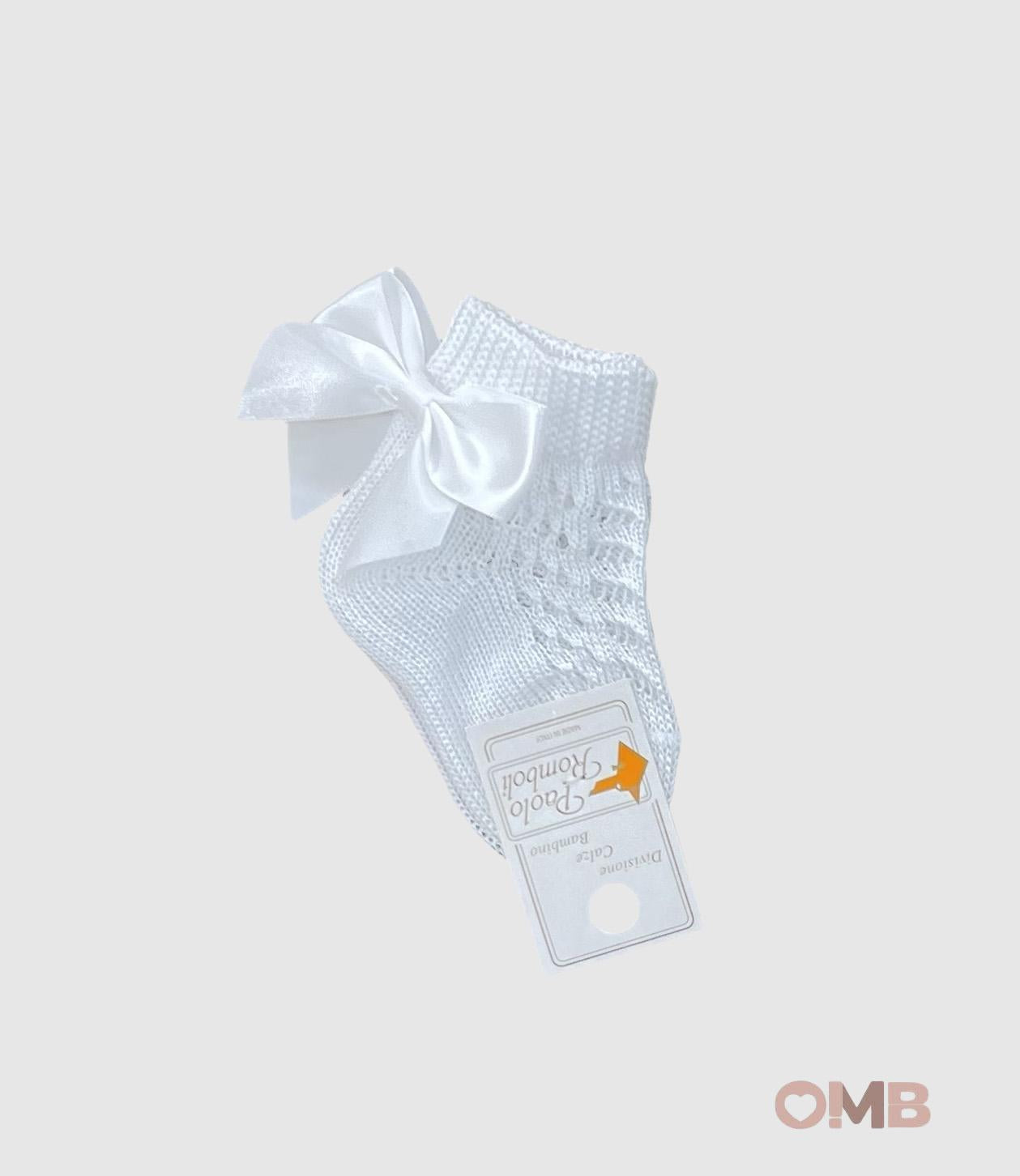 Calzini corti neonata. Dettaglio fiocco in tinta e traforati.
