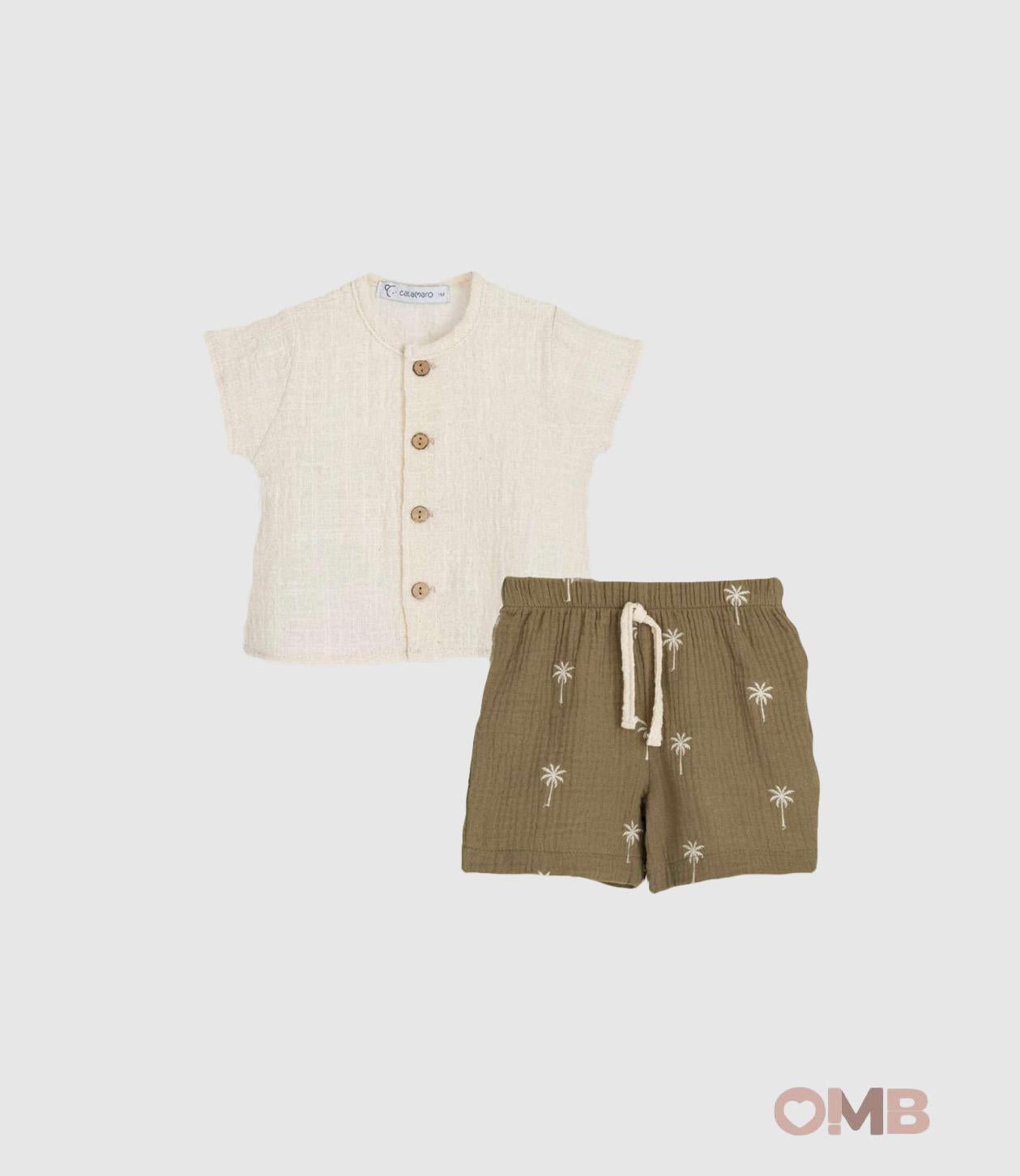 Completo neonato composto da camicia con maniche corte, tinta unita con bottoncini a contrasto e short con fantasia palme ed elastico in vita.