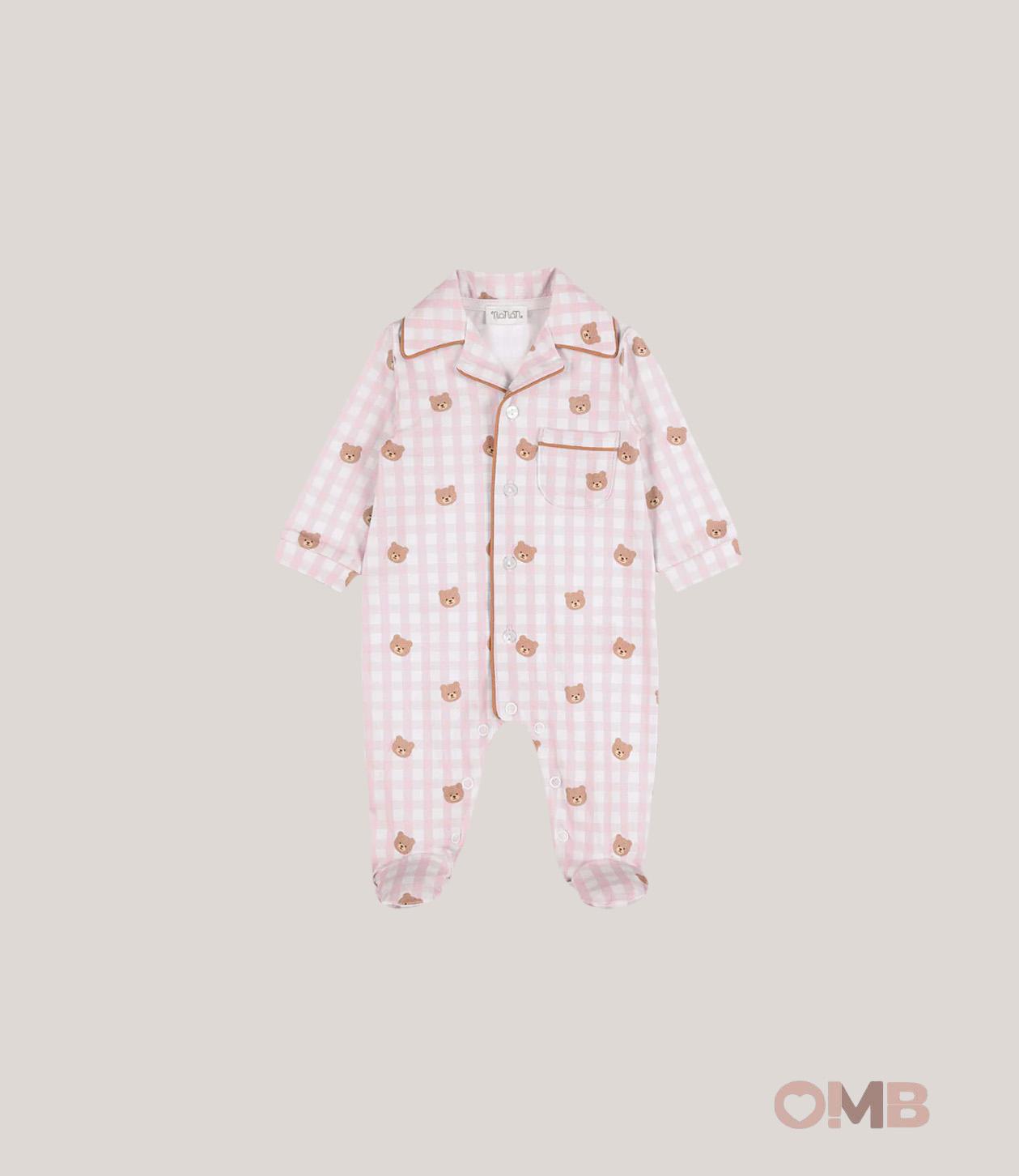 Tutina con motivo check rosa e off white e tenera fantasia di orsetti allover.